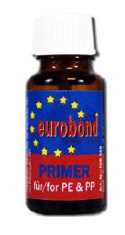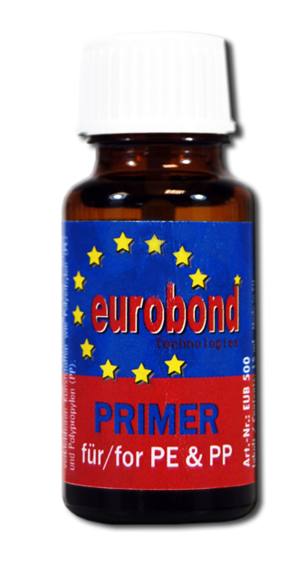 Der EUROBOND Primer ist ein lösungsmittelhaltiges Vorbehandlungsmittel zur Verbesserung der Adhäsionsfestigkeit des EUROBOND CA Klebstoffs an unpolaren Kunststoff-Oberflächen. Der EUROBOND Primer eignet sich besonders zum Vorbehandeln von Polyolefinen, wie Polyäthylen, Polypropylen, Silikon, Teflon und thermoplastischen Kunststoffen.